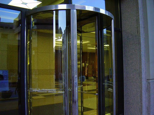 This is a 'no smiking' sign on a revolving door at the building used for bureaucracy in Indianapolis, Indiana.